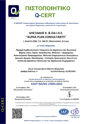 Η Alpha Plan Consultants ανταποκρινόμενη στις απαιτήσεις της σύγχρονης επιχειρηματικής πραγματικότητας και στοχεύοντας στην προστασία της πληροφορίας και των προσωπικών δεδομένων που διαχειρίζεται, αποσκοπώντας πάντα στην απρόσκοπτη και υποδειγματική εξυπηρέτηση των πελατών της μέσω της διατήρησης της εμπιστευτικότητας, της διαθεσιμότητας και της ακεραιότητας κάθε πληροφορίας, αποφάσισε να σχεδιάσει και να εγκαταστήσει ένα Σύστημα Διαχείρισης Ασφάλειας Πληροφοριών σύμφωνα με τις απαιτήσεις του Διεθνούς Προτύπου ISO 27001:2019 & ISO 27701:2022.