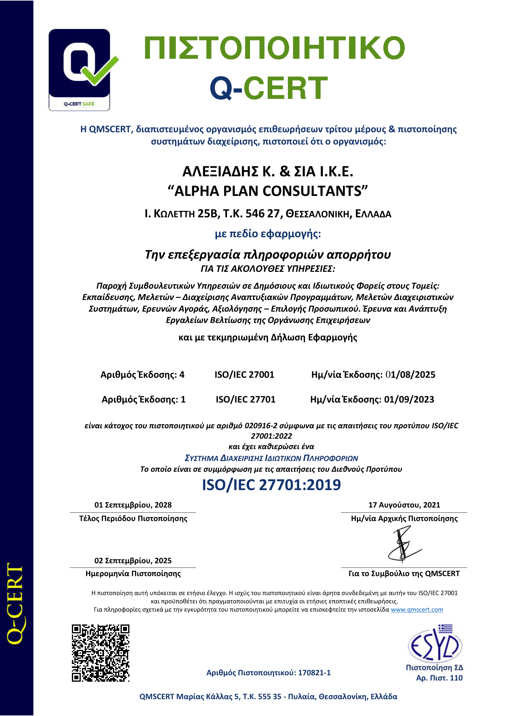 Η Alpha Plan Consultants ανταποκρινόμενη στις απαιτήσεις της σύγχρονης επιχειρηματικής πραγματικότητας και στοχεύοντας στην προστασία της πληροφορίας και των προσωπικών δεδομένων που διαχειρίζεται, αποσκοπώντας πάντα στην απρόσκοπτη και υποδειγματική εξυπηρέτηση των πελατών της μέσω της διατήρησης της εμπιστευτικότητας, της διαθεσιμότητας και της ακεραιότητας κάθε πληροφορίας, αποφάσισε να σχεδιάσει και να εγκαταστήσει ένα Σύστημα Διαχείρισης Ασφάλειας Πληροφοριών σύμφωνα με τις απαιτήσεις του Διεθνούς Προτύπου ISO 27001:2019 & ISO 27701:2022.